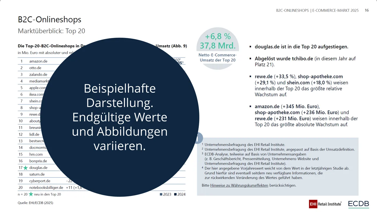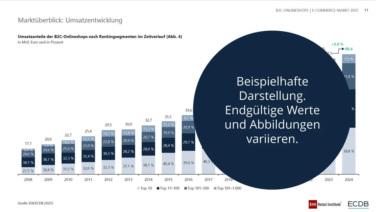 Die Studie "E-Commerce-Markt Deutschland 2025" ist seit 17 Jahren die Benchmark-Studie für den deutschen eCommerce-Markt. Gemeinsam mit unserem Partner, dem EHI Retail Institute, untersuchen wir seit 2009 den deutschen Markt und können somit auf eine fundierte Datenkompetenz und einen großen Erfahrungsschatz zurückgreifen. Ziel der Studie ist es, die Top 1.000 größten B2C-Onlineshops und die Top 10 B2C-Marktplätze in Deutschland zu analysieren und ein umfassendes Onlineshop- und Marktplatz-Ranking auf Basis von Nettoumsatz und Bruttowarenvolumen zu generieren.