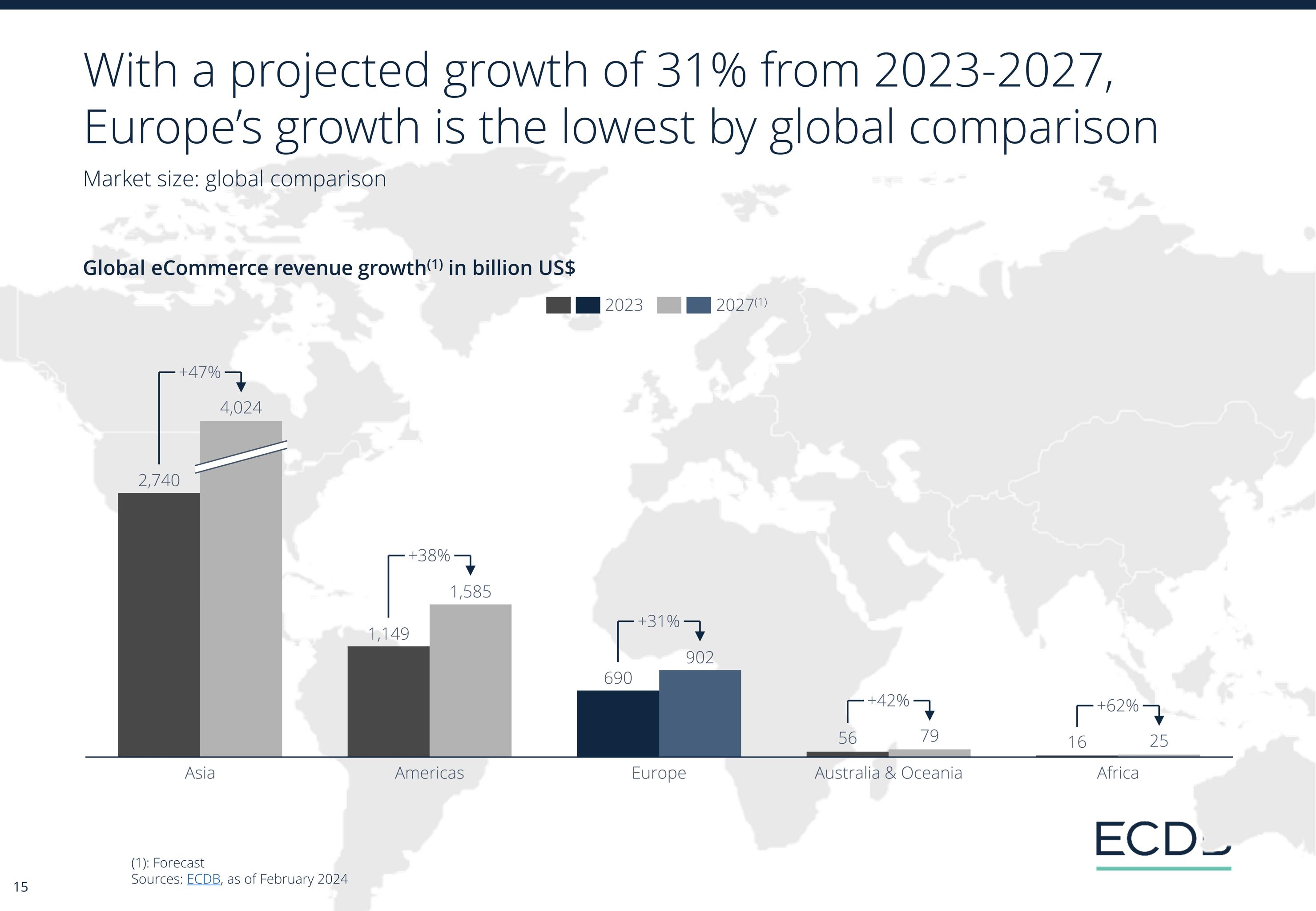 With an average yearly revenue growth of 7% between 2023 and 2027, the eCommerce market in Europe is projected to continue developing strongly and surpass the milestone of US$1 trillion of eCommerce revenues by the middle of the decade.