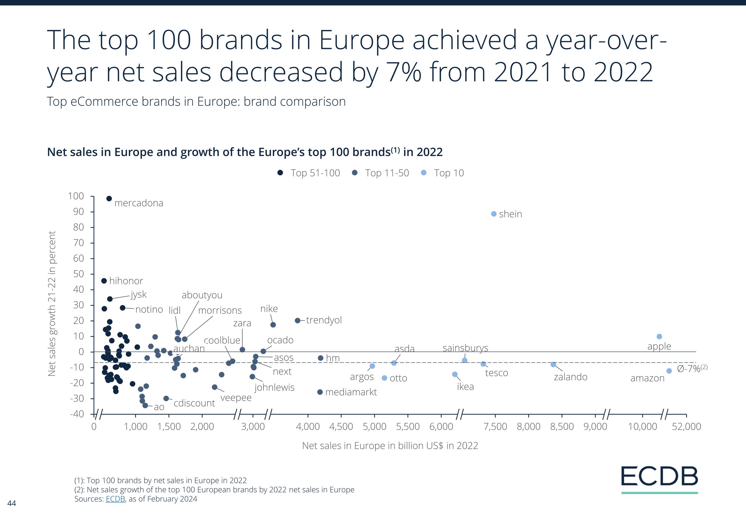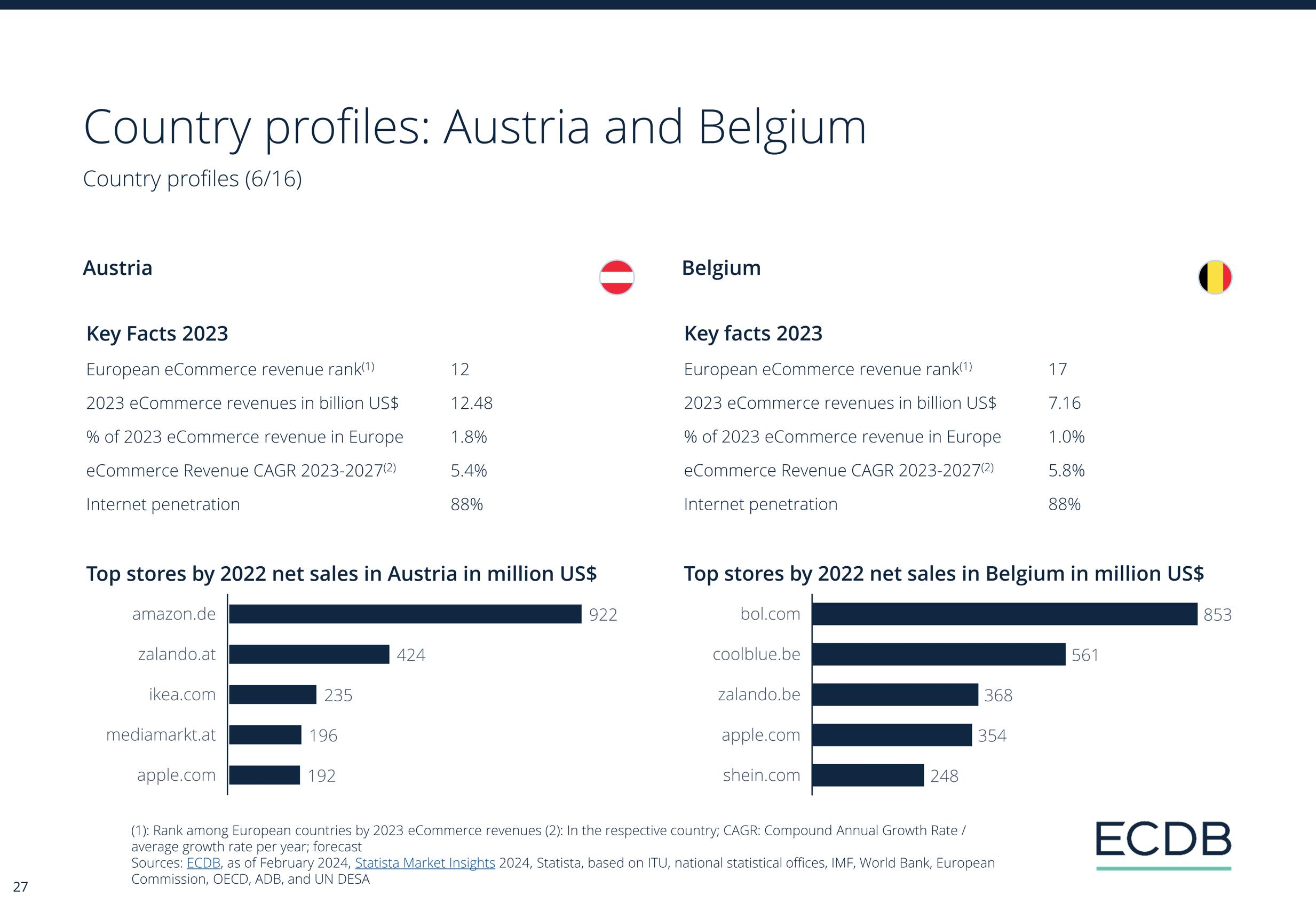 Within the context of Europe’s growing market, this report takes a closer look at individual countries, top categories, and the strongest brands. A thorough analysis of 27 national eCommerce markets not only allows a deep dive into local top players, but also highlights the dominance of Amazon, especially in Western Europe. With a total of roughly US$52 billion eCommerce net sales in Europe in 2022, the tech company was able to generate more net sales than the following eight companies (including Zalando, Apple, and Tesco) combined.