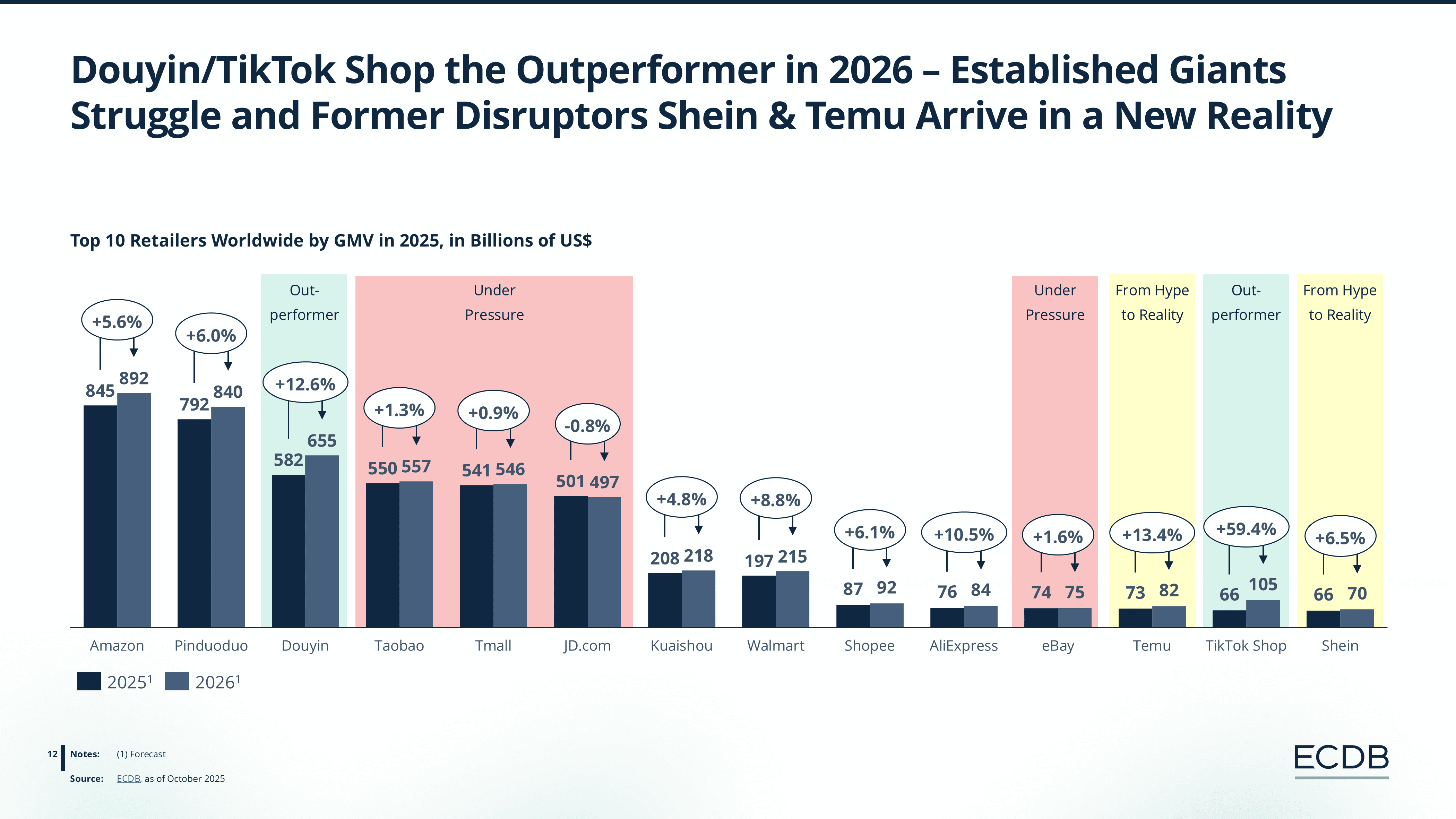 The whitepaper also explores eCommerce future trends across categories, showing how Grocery outperforms while Electronics and Hobby lose ground. Beyond categories and countries, the eCommerce industry outlook examines retailer performance. Established giants face headwinds, while disruptors such as Shein and Temu, once high flyers, encounter limits to their hypergrowth.